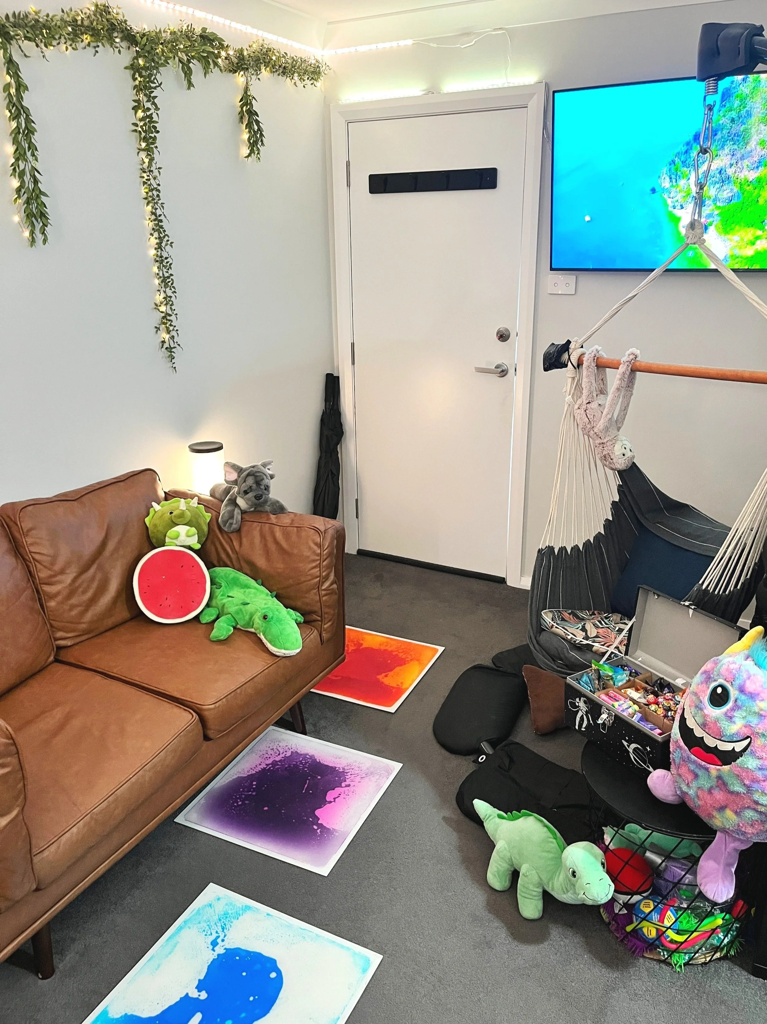 THERAPY ROOM: You will enter into the cozy therapy room, complete with mood lighting & music, therapy swing, fidgets and sensory toys.